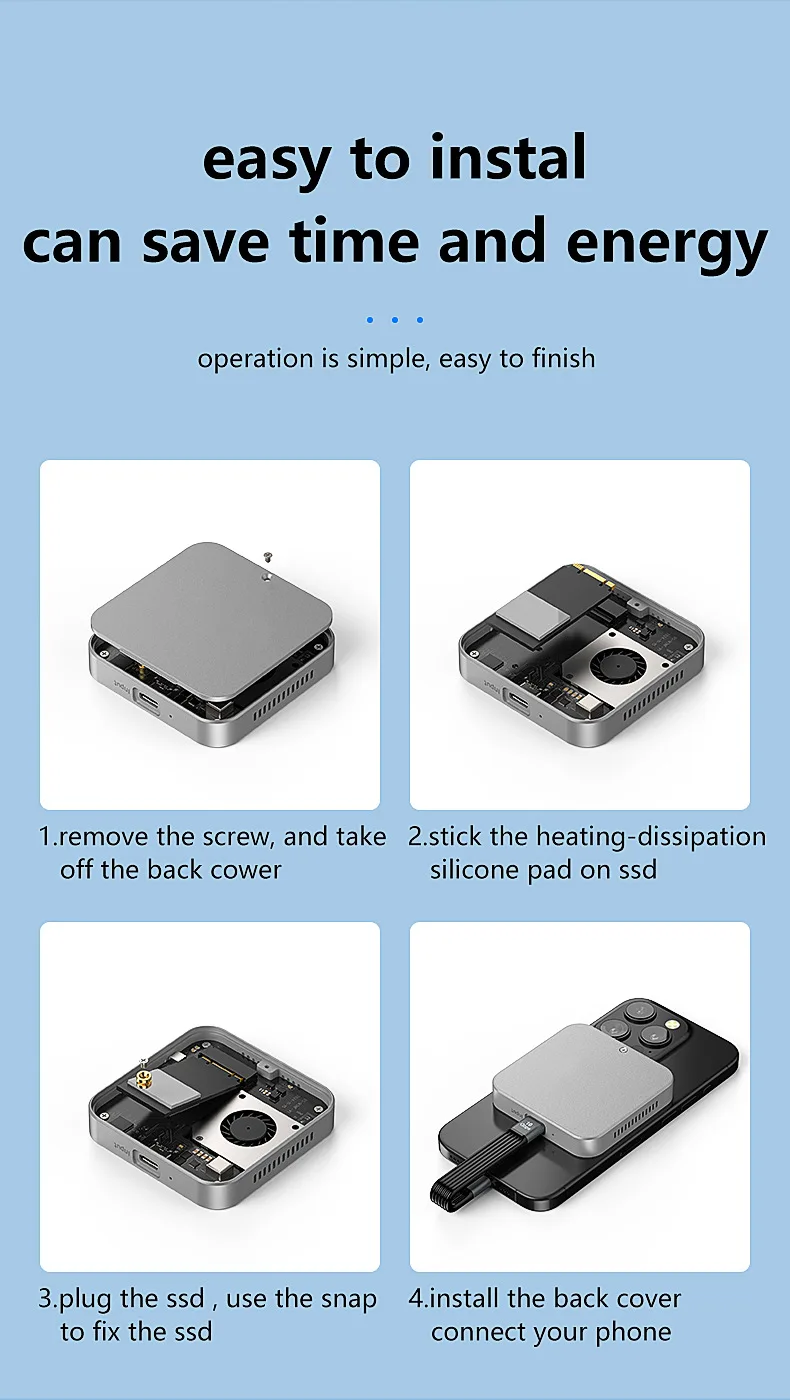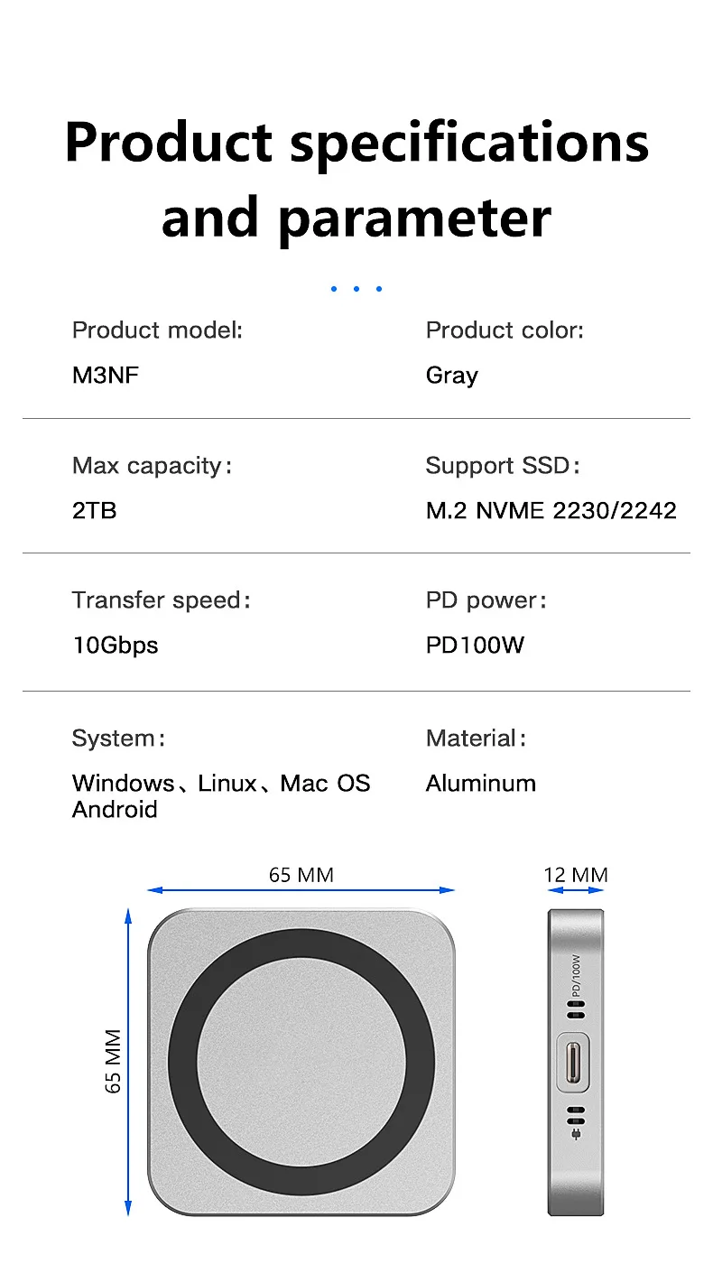 M.2 NVMe USB3.0 Phone Magnetic SSD Enclosure with Turbo Fan 10 Gbps PD 100W Support 2T for Model NVME Both 2230and2242 SSDPls